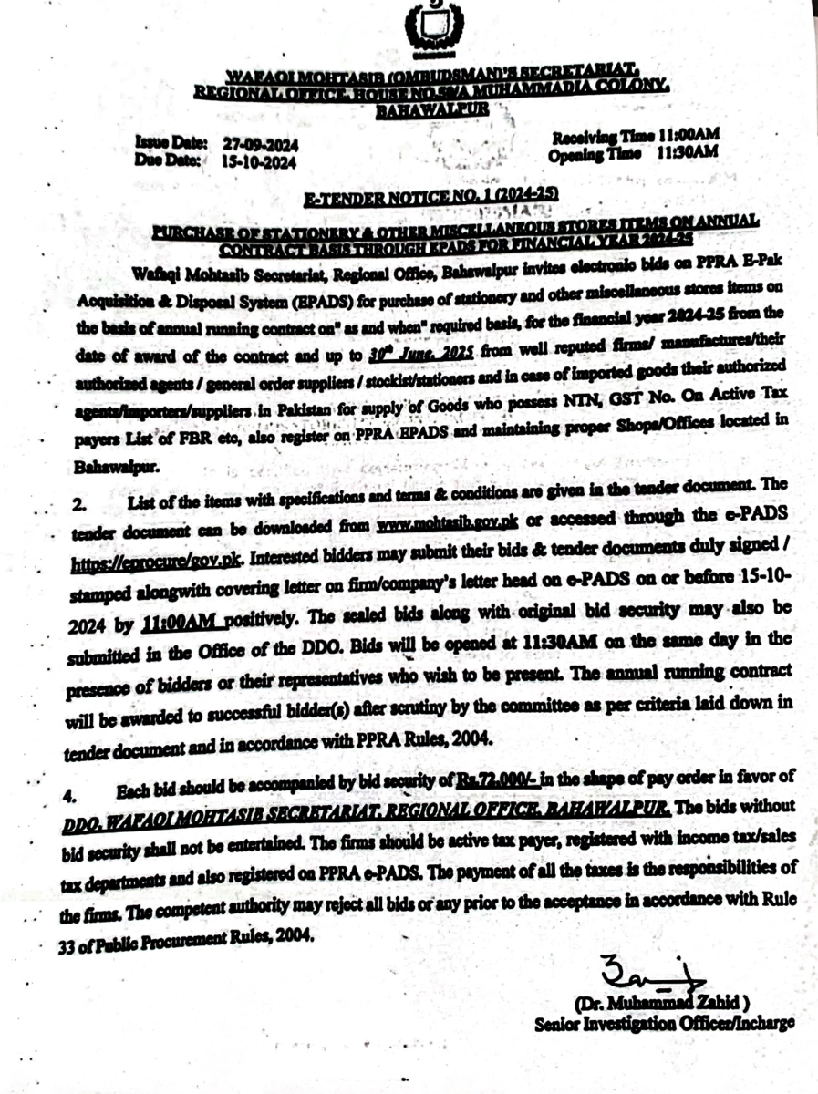 Bahawalpur Tender Notice (2024-25): Procurement of misc. items for the Wafaqi Mohtasib Secretariat (WMS) Regional Office Bahawalpur.