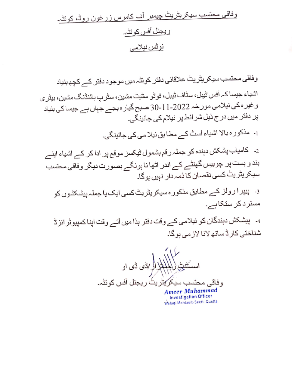Auction Notice Regional Office Quetta