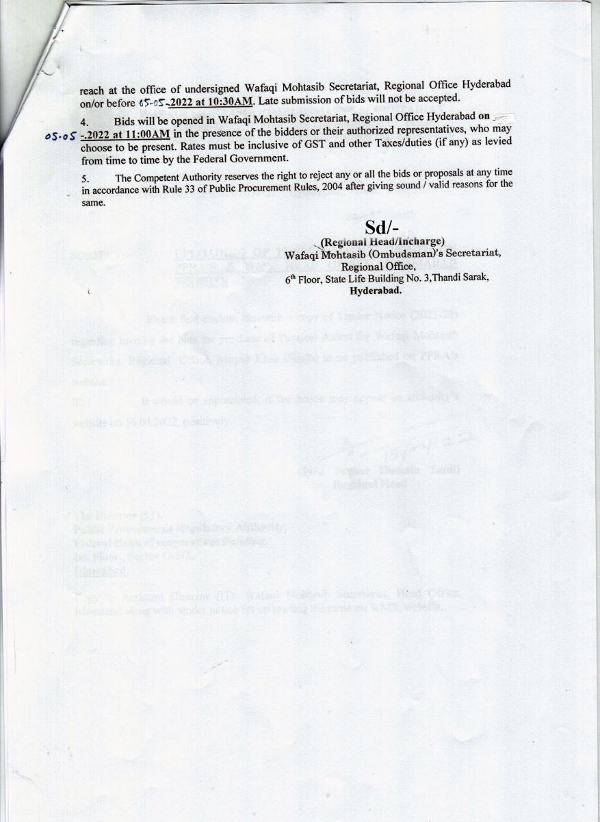 HYD Tender Notice No. 1 (2021-22): Procurement of Stationery & other misc. items for the Wafaqi Mohtasib Secretariat (WMS) Regional Office Hyderabad.