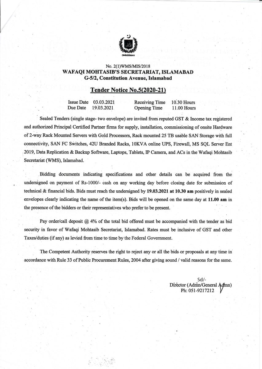 Tender Notice No. 5 ISB: Up-gradation and Expansion of Data Centre of Wafaqi Mohtasib Secretariat.