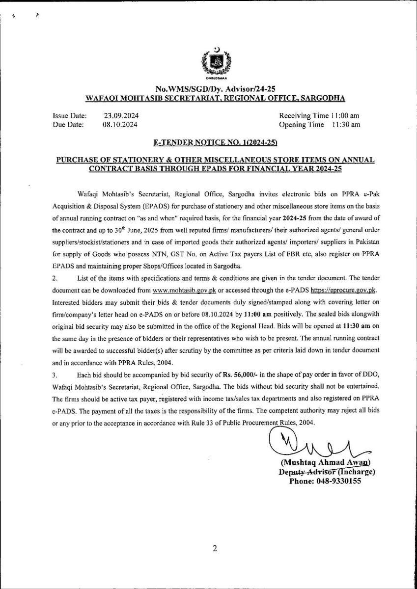 Procurement of Stationery & other misc. items for the Wafaqi Mohtasib Secretariat (WMS) Regional Office Sargodha