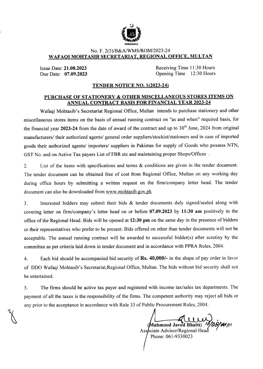 Tender Notice No. 1 (2023-24): Procurement of Stationery & other misc. items for the Wafaqi Mohtasib Secretariat (WMS) Regional Office Multan.