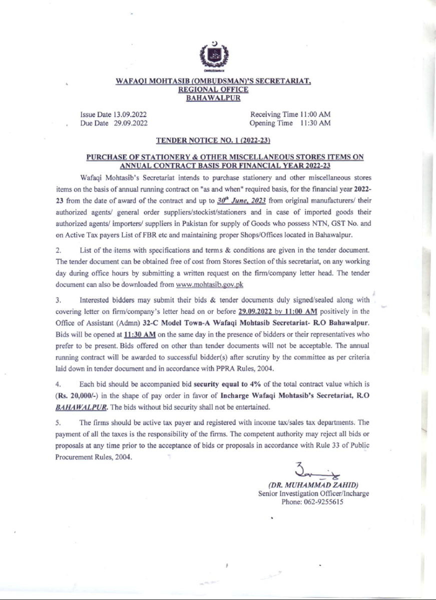 Bahawalpur Tender Notice No. 1 (2022-23): Procurement of misc. items for the Wafaqi Mohtasib Secretariat (WMS) Regional Office Bahawalpur.