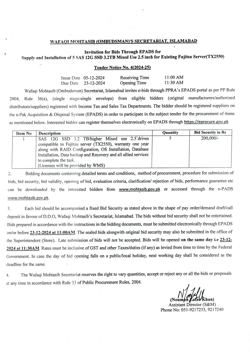 Invitation for Bids Through EPADS for Supply and Installation of SAS 12G SSD 3.2 TB Mixed use 2.5 Drives in Existing Fujitsu Server