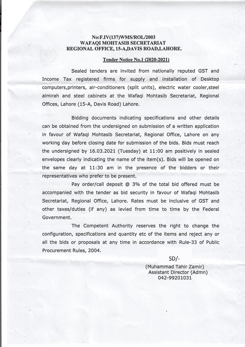 Tender Notice 1 LHR: Procurement of miscellaneous items for Wafaqi Mohtasib Secretariat Regional Office Lahore