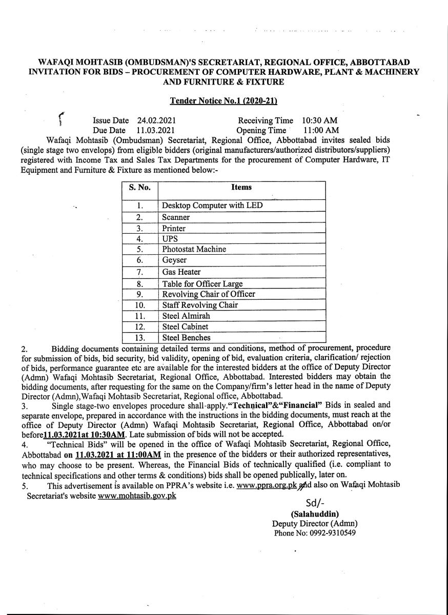 Tender Notice 1 ABT: Procurement of computer hardware, plant and miscellaneous items for the WMS Regional Office Abbottabad.