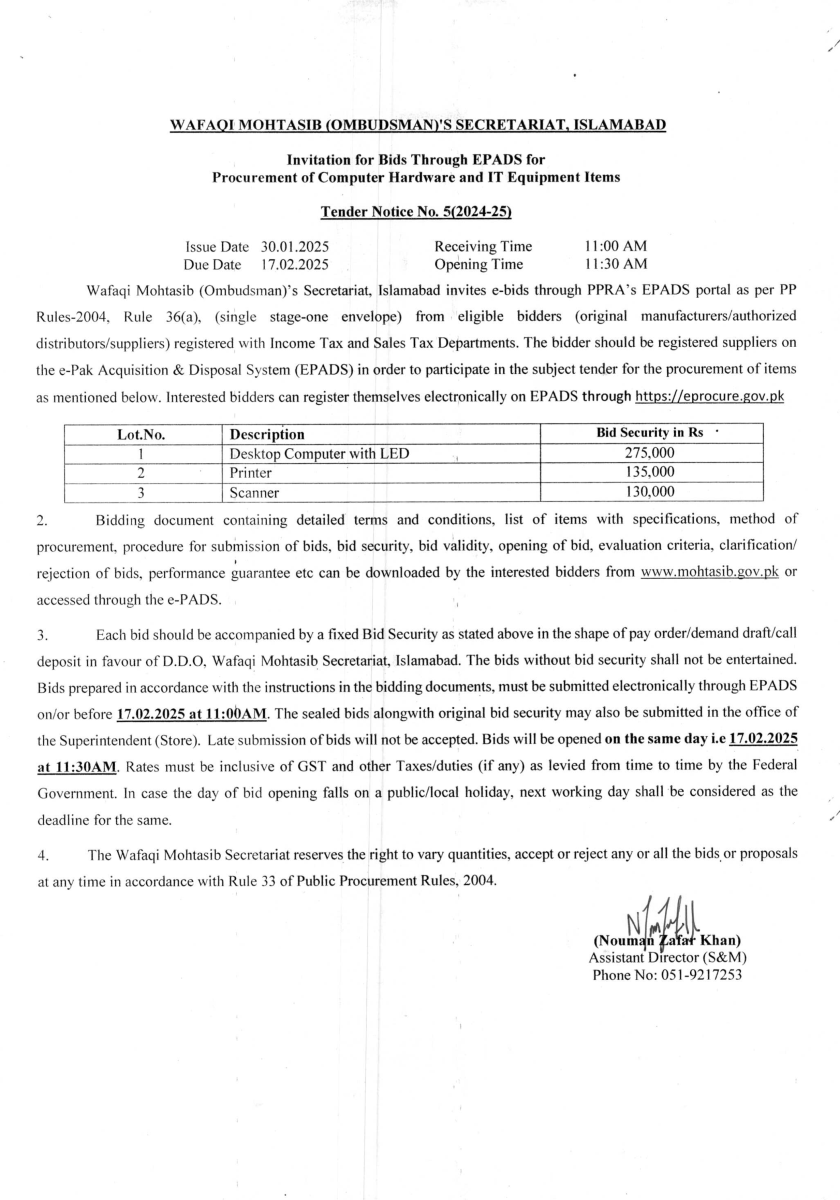 Invitation for Bids Through EPADS for procurement of Computer Hardware and Software Items