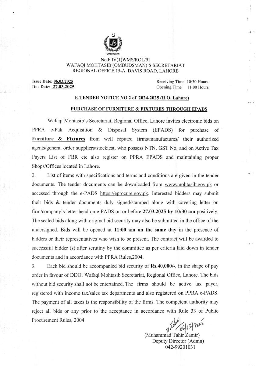 Tender Notice No. 2 (2024-25): Purchase of Furniture and Fixtures for the Wafaqi Mohtasib Secretariat (WMS) Regional Office Lahore through EPADS.