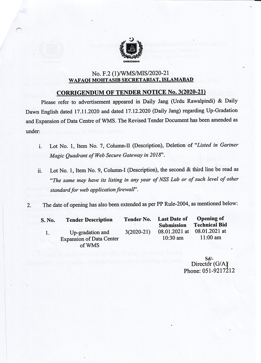 Corrigendum of tender notice no. 3(2020-21): Up-gradation and Expansion of Data Center of Wafaqi Mohtasib Secretariat (WMS)
