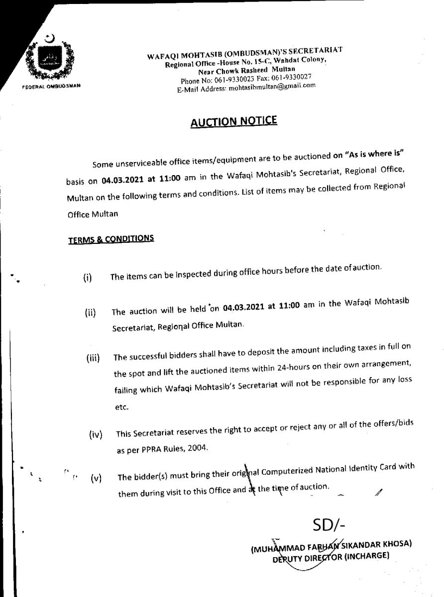 Auction Notice 1 MLT: for miscellaneous unusable items in the Regional Office, Multan
