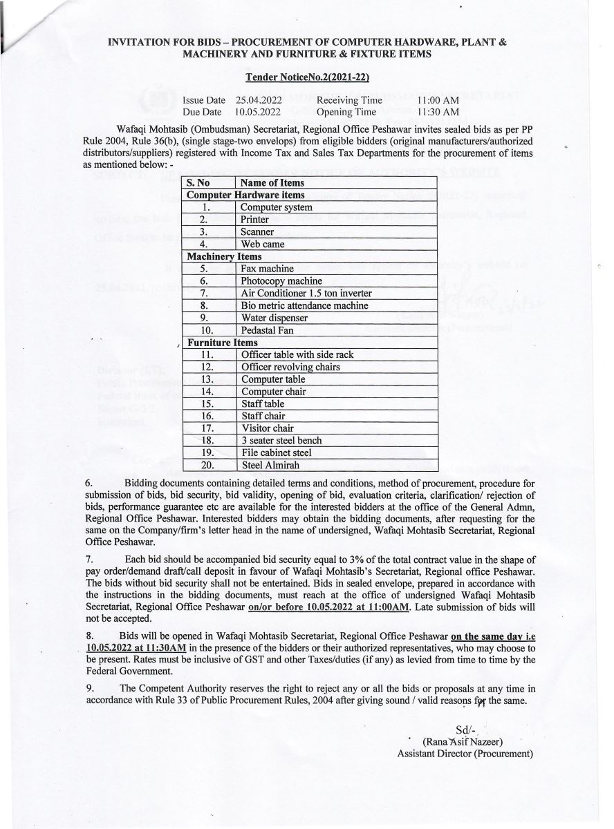 Swat Tender Notice 2 (2021-22): Procurement of computer hardware and misc. items for the Regional Office Peshawar.